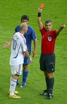 2006년 FIFA 월드컵 결승전 프랑스와 이탈리아의 경기 중 프랑스의 주장 지네딘 지단은 이탈리아 수비수 마르코 마테라치의 가슴을 머리로 가격했고 이로 인해 지단은 레드 카드를 받았습니다. 지단의 국가대표, 클럽 커리어를 통틀어 생애 마지막 경기였던 월드컵 결승전은 이렇게 아쉽게 마감해야 했습니다. 우승은 이탈리아의 차지 였습니다.