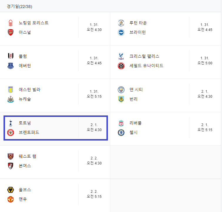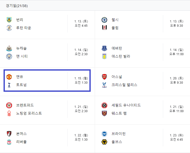 프리미어리그 1월 경기 일정
