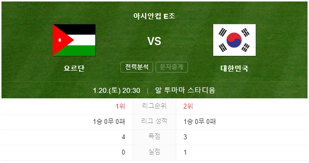 요르단은 조별리그 1차전에서 말레이시아를 상대로 4-0 대승을 거뒀습니다. 현재 골득실차에 의해 E조 1위 입니다.
